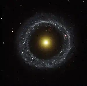 يعتقد أن هذا النوع يتسبب عندما تحتك مجرة صغيرة بنواة مجرة حلزونية ثم تفقدها أذرعها التي تلتحم مُشَكِّلَةً طوق أو خاتم حول النواة،[128] حدث مشابه يعتقد أنه أثر بمجرة المرأة المسلسلة لأن رؤيتها بالأشعة تحت الحمراء تظهر للعلماء أن لها بُنية تشبه عدة خواتم في آن واحد.[129]