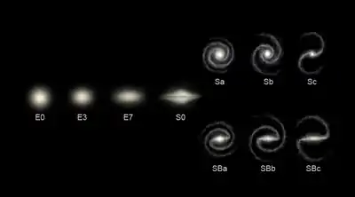 تتشكل المجرات من ثلاثة أنواع:[87][88][89] إهليجية، وحلزونية، وشاذة أو غير منتظمة، على أن هناك أنواعاً أخرى أكثر شمولية تختلف اختلافاً بسيطاً عن تلك سالفة الذكر موجودة في تصنيف المجرات الذي ابتدعه هابل، وطالما أنه يعتمد أساساً على الضوء المرئي لتحديد خصائص المجرات فإنه يفوت خصائص مجريّة مهمة للغاية كمعدل ولادة النجوم في مجرات الانفجار النجمي، وكذلك النشاطات التي تحدث في أنوية المجرات النشطة،[9] هذه الخصائص لا تظهر بالضوء المرئي وإنما تحتاج معدات أخرى أكثر تعقيداً لاستخراجها.[90]