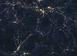 تلعب المادة المظلمة دوراً مركزياً في نمذجة تشكل البنية المجرية وتشكل وتطور المجرات، ولها تأثيرات قابلة للقياس على عدم توحد الخواص الملاحظ في الخلفية الميكرونية الكونية، كل هذه الدلائل تقترح أن المجرات، وعناقيد المجرات، والكون ككل يحتوي على مادة أكثر بكثير من تلك التي تتفاعل مع الإشعاع الكهرومغناطيسي، وهذا ما يوقع العلماء في أكثر المعضلات العلمية غموضاً.[85]