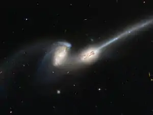 وتوجد المجرتان حاليا في حالة تصادم وتداخل مع بعضهما البعض. وترجع تسميتهم إلى ذيلهما الطويلين الناشئين عن قوي مد وجدب المجرات بينهما - أختلاف قوى الجاذبية المؤثرة على الأجزاء القريبة والأجزاء البعيدة من المجرتين - وتسمى هنا مد وجزر المجرات galactic tide.