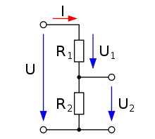 مجزئ للجهد مكون من مقاومتين R1 و R2 علي التوالي ، الجهد الداخل U.