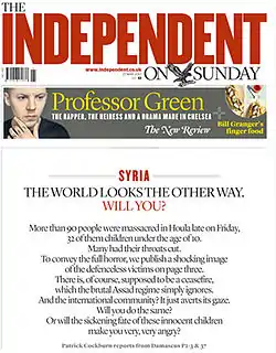 - Cockburn, Patrick (27 May 2012). "Exclusive dispatch: Assad blamed for massacre of the innocents". ذي إندبندنت. مؤرشف من الأصل في 27 مايو 2012. اطلع عليه بتاريخ 27 مايو 2012. الوسيط