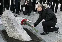 الرئيس الروسي فلاديمير بوتين يضع الزهور، في 1 فبراير 2008، على النصب التذكاري لضحايا المذبحة.