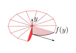 - إذا كان المجسم الدوراني ينتج عن دوران منطقة مستوية حول محور الصادات فإنه حجمه يعطى بالمعادلة: