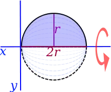 | اسم الجسم | ينشأ عن دوران | معادلة المنطقة المستوية | تمثيل الشكل | معادلة حساب الحجم |