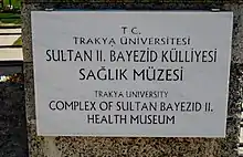 - Centre, UNESCO World Heritage. "Sultan Bayezid II Complex: A Center of Medical Treatment - UNESCO World Heritage Centre". whc.unesco.org (باللغة الإنجليزية). مؤرشف من الأصل في 05 أبريل 2019. اطلع عليه بتاريخ 19 أكتوبر 2018. الوسيط