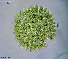 المجمع أو الزمرة أو سينوبيوم coenobium (ومجموعها سينوبيا coenobia) المكونة من وحدات خلوية متصلة جزئياً في شكل سلاسل أو في شكل تجمعات مختلفة من الخلايا الفردية.[1] وتكون هناك عدد قليل جداً من الخلايا المتخصصة أو تكون هذه معدومة. وغالباً ما يتم تضمين الخلايا في مصفوفة صمغية التي يمكن أن تكون متحركة أو غير متحركة. وتشمل الأمثلة الفولفوكس (الاسم العلمي:طحلب الفولفكس Volvox) وأقارب لها والScenedesmus والبدياسترم (الاسم العلمي:Pediastrum) وHydrodictyon.
