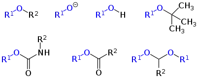 أبسط أمثلة مجموعات الألكوكسي هي مجموعة ميثوكسي (–CH3O)؛ من الأمثلة الأخرى كذلك مجموعة إيثوكسي (–CH3CH2O).