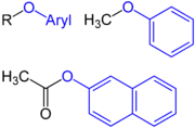 عندما ترتبط ذرة الأكسجين بمجموعة أريل تعرف المجموعة حينها بالاسم العام أريلوكسي؛ ومثال عليها مجموعة فينوكسي (–C6H5O).