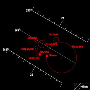 الرسم البياني يقارن العناصر المدارية والأحجام النسبية للأعضاء الأساسيين في مجموعة أنانك. المحور الأفقي يبين متوسط المسافة بين الأقمار و كوكب المشتري ، والمحور الرأسي يوضح ميولهم المدارية، أما دوائرهم فتشير إلى الأحجام النسبية.