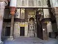 يتوسط الواجهة الباب الرئيسي وهو مكسو بالرخام الملون، وعلى مصراعيه كسوة نحاسية مفرغة برسوم هندسية، وسماعتاه على شكل رأس حيوان. يؤدي هذا الباب إلى دهليز له سقف خشبي فتحت على جانبيه أبواب وشبابيك متقابلة للقبة والمدرسة، وينتهي إلى باب يؤدي إلى البيمارستان. وللقبة بابان مفتوحان على هذا الدهليز، الأول يؤدي إليها مباشرة والثاني يؤدي إلى القاعة أمامها وهي فناء أو فسحة معدة لإقامة المماليك الموجودين بهدف حراسة القبة.[6]:ج1ص116:123[16]