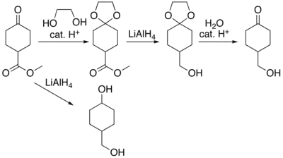 تستخدم مجموعات الحماية على المركبات الكيميائية سهلة التفاعل في بعض تفاعلات الاصطناع العضوي، التي تتطلب استخدام كواشف كيميائية قوية، مما يلزم حماية بعض المجموعات الوظيفية في تلك المركبات. على سبيل المثال، يتصف كاشف هيدريد ألومنيوم الليثيوم LiAlH4 بأنه من المختزلات القوية القادرة على اختزال الاسترات إلى كحولات، ولكن في حال وجود مجموعة كيتون إضافية في الإستر، فإن LiAlH4 سيقوم باختزالها أيضاً، مما يتطلب حمايتها، وذلك عن طريق إجراء تفاعل أستلة عليها في الأول، وتحويلها من كيتون إلى أسيتال، ومن ثم يتم الاختزال بالهيدريد. بعد إتمام الاختزال تزال مجموعة الحماية عن الكيتون بالمفاعلة مع الحمض بمرحلة تسمى إزالة الحماية.