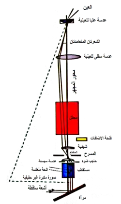 - عدسة برتراند: وهي عدسة صغيرة تقع مباشرة تحت العدسة العينية، وهي موضوعة على شريحة متحركة داخل أنبوبة المجهر، كما يمكن ادخالها أو ازاحتها بسهولة من مسار الضوء داخل المجهر، وعمل هذه العدسة هو السماح للمشاهد أو مستخدم المجهر برؤية بعض الظواهر أو الصفات البصرية التي تعرف بصور التداخل التي ترى بالقرب من السطح العلوي للشيئية، حيث لرؤيتها يجب إزالة العدسة العينية، ولكن في حالة استخدام عدسة برتراند يمكن مشاهدة صور التداخل في وجود العينية.[3]