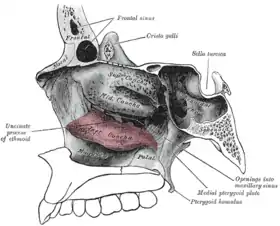 ![]() الجدار الأنسي للحجاج الأيسر (المحارة الأنفية السفلية باللون الأصفر). | |