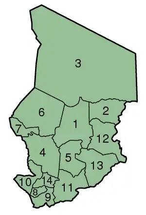 | 3 | بوركو إندي تيبستي | Borkou-Ennedi-Tibesti | فايا-لارجو | Faya-Largeau | بوركو، إندي، تيلستي |