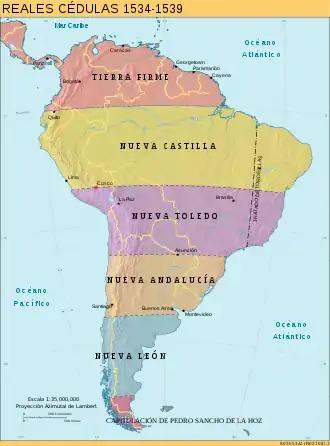 ![]() خريطة إسبانية للتقسيم الإداري لقشتالة جديدة صُنعت في 1535 | |||||||||||