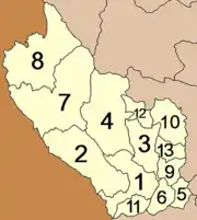 تنقسم المحافظة الي 13 مقاطعة و 98 بلدية و 887 قرية