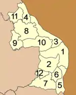 تنقسم المحافظة الي 12 مقاطعة رئيسية التي بدورها تنقسم الي 97 بلدية و 1040 قرية