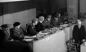 ![]() مدانين معتقل رافنسبروك بالملابس المدنية محاطين بقوات الحلفاء بالملابس الرسمية خلال محاكمات هامبورغ رافنسبورك عام 1947. | |