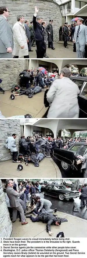 |CitationClass=تم تجاهله (مساعدة) - Sheard, Chester; Amy Diamond (March 31, 1981). "News of assassination attempt leave people dazed and upset". Milwaukee Sentinel. صفحات Part 1, page 9. مؤرشف من الأصل في 28 يناير 2020. اطلع عليه بتاريخ 11 مارس 2011. الوسيط