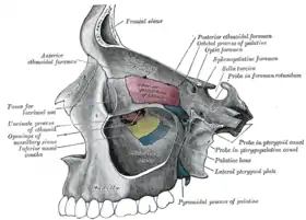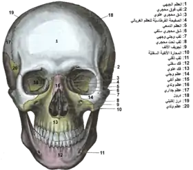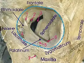 ![]() رسم تخطيطي للعين يظهر العضلات المستقيمة العلوية والسفلية والوسطية والعضلة المائلة السفلية؛ ويظهر الثقب فوق المحجري فوق العين، والشق السفلي للمحجر متوضعا بصورة سفلية جانبية. | |