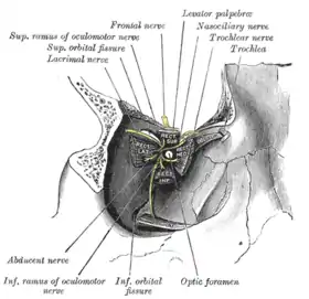 تشريح يظهر منشأ العضلات العينية اليمنى، والأعصاب الداخلة للشق المحجري العلوي