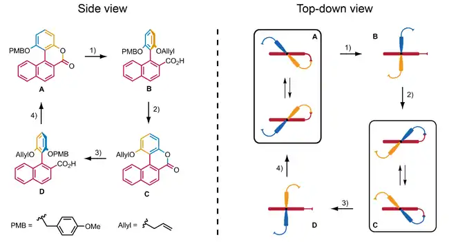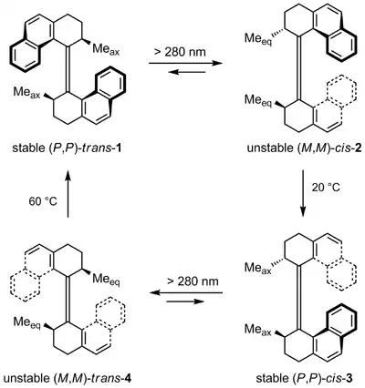وهنا نلاحظ أن دورةً واحدةً من الحركة الدائرية أحادية الإتجاه تأخذ أربعة خطواتٍ تفاعلية. حيث تتمثل الخطوة الأولى في عملية التماكب المحفزة ضوئيا ممتص للحرارة للمتماكب (P,P) المفروق 1 إلى المتماكب ( M،M ) المقرون 2 ، حيث تشير p إلى الحلزون المتجه إلى الجانب الأيمن، في حين تشير M إلى الحلزون المتجه إلى الجانب الأيسر. في هذه العملية، تتحول مجموعات الميثيل من التشكل المحوري إلى الاستوائي الأقل تفضيلاً للإعاقة الفراغية.