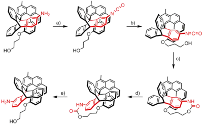 حيث يعتمد ذلك الدوران على خمسة خطواتٍ. تبدأ العملية بتحول مجموعة الأمين الموجودة على جزء التريبتيسين إلى مجموعة الإيززوسيانات الوظيفية بالتكاثف مع جزيء الفوسجين ( أ ). يؤدي الدوران الحراري أو التلقائي حول الرابطة المركزية إلى تقريب مجموعة الإيزوسيانات الوظيفية إلى مجموعة الهيدروكسيل الموجودة على جزء الهيليسين ( ب )، مما يسمح لكلتا هاتين المجموعتين بالتفاعل مع بعضهما الآخر ( ج ). حيث يحتجز ذلك التفاعل بصورةٍ غير عكوسة هذا النظام على شكل يوريثان حلقي مجهَد، والذي يتسم بأنه أعلى في الطاقة، ومن ثم يكون أقرب بقوة إلى حاجز طاقة الدوران من الحالة الأصلية. ومن ثم فالمزيد من دوران جزء التريبتيسين يتطلب قدراً صغيراً نسبياً فقط من التنشيط الحراري بهدف التغلب على ذلك الحاجز، ومن ثم إطلاق ذلك الإجهاد ( د ). وفي النهاية، فإنه بانفصام مجموعة اليوريثان يستعيد الجزيء مجموعة الأمين والمجموعات الوظيفية الكحولية الخاصة به ( هـ ).