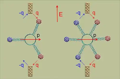 حيث يُستخدم حقل كهروستاتيكي (ساكن) متجانس E، والموجه على طول الاتجاه العمودي، من أجل الشحن وتفريغ الشحن الدوري للشفرات بواسطة النفق الإلكتروني من قضبين كهربائيين معدنيين معتدلين. حيث يغير كل فوليرين من إشارة شحنته في حين أن إلكترونين لهما الشحنة q من القطب الكهربائي المعتدل لهذا الفوليرين، حيث يصبح محفَزَاً بواسطة المجال الكهربي E ليدور صوب القطب الكهربي الآخر. ثم تفقد هذه العملية إلكترونيين إثنين (تحول إشارة الشحن مرةً أخرى) للقطب الكهربي عبر النفق الإلكتروني مكملاً نصف دائرةٍ في دورته. يحدث النصف الآخر من الدورة بشكل مماثل لذلك. ومن ثم، يُصبح المحرك محفَّزّاَ بواسطة ثلاثة (ستة) فوليرينات دوارة مستمرة متوالية. هذا ويحافظ المحرك الجزيئي على ثنائية القطب p، والتي تكون في المتوسط متعامدةً على إتجاه المجال الكهربي E، مولدةً بذلك عزماً للدوران.