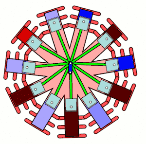 - لتوليد قدرة 100حصان (75 كيلو وات) عند السرعة الدورانية المنخفضة التي تعمل عليها محركات ذلك الوقت. كانت النبضات الناتجة من شوط الاحتراق كبيرة لحد ما، ولإخماد هذه النبضات احتاجت المحركات استخدام حدافة كبيرة مما زاد وزن المحرك. في المحركات الدوارة، يعمل المحرك نفسه كحدافه لذلك يكون أخف وزنا من المحركات الاعتيادية المشابهة.