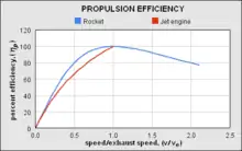 تتغير كفاءة الطاقة للمحرك التفاعلي بسبب الطاقة المبددة في الخرج وذلك نسبة إلى سرعة العربة. اللون الأزرق للمحركات شبه الصاروخية، الأحمر للمحركات الهوائية