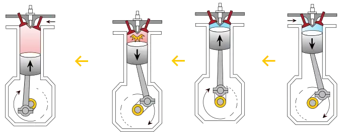 محركات الاحتراق الداخلي تعمل من خلال سلسلة من الأشواط التي تضيف وتزيل الغازات من وإلى الاسطوانة. هذه العمليات تتكرر دوريا. والمحرك يسمى ذو شوطان أو اربعة أو ستة اشواط اعتمادا على عدد الاشواط التي تستغرقه لإكمال دورة.