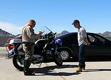 ضابط شرطة سير يحرر مخالفة سير لسائق سيارة بسبب السرعة.