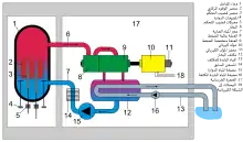 المفاعل النووي وهو قلب المحطة حيث يتم توليد الحرارة الأساسية للمفاعل من خلال الانشطار النووي الخاضع للرقابة ومع هذا فالحرارة يتم تسخينها بواسطة المبرد الذي يقوم بعملية الضخ من خلال المفاعل وبالتالي تتلاشى الطاقة من المفاعل. أيضاً يتم استخدام الحرارة من الانشطار النووي لرفع البخار الذي يمر عبر توربينات البخار. حيث تقوم التوربينات بعمل قوى للمولدات الكهربائية .