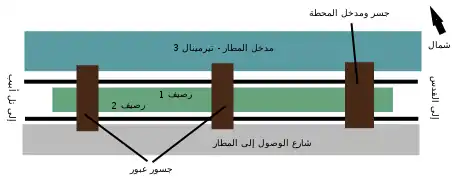 ![]() قطار متجه غربًا في المحطة، كما يُرى من طابق القادمين من المطار. قطار متجه غربًا في المحطة، كما يُرى من طابق القادمين من المطار. | |||||||