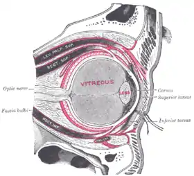 ![]() مقطع سهمي للعين اليمنى يظهر محفظة تينون. | |