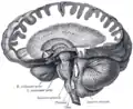مقطع أفقي في نصف الكرة المخي الأيمن (المحفظة الغائرة يشار لها في أعلى اليسار). | |
