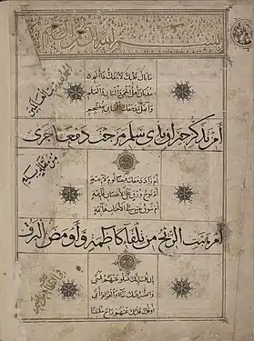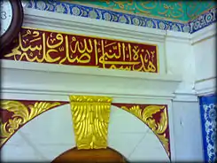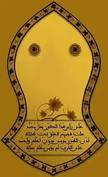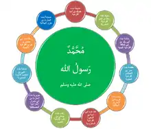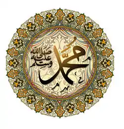 | «أحمد، أبو القاسم، أبو الطيّب، نبي التوبة، نبي الرحمة، نبي المرحمة، نبي الملحمة، الرحمة المهداة، سيد ولد آدم، حبيب الرحمن، المختار، المصطفى، المجتبى، الصادق، المصدوق، الأمين، صاحب الشفاعة والمقام المحمود، صاحب الوسيلة والفضيلة والدرجة الرفيعة، صاحب التاج والمعراج، إمام المتقين، سيد المرسلين، قائد الغر المحجلين، النبي الأمّي، رسول الله، خاتم النبيين، الرسول الأعظم، السراج المنير، النور،[1][2] الرؤوف الرحيم بالمؤمنين، العروة الوثقى» | ||