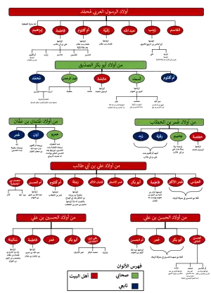 | النسب | من العرب من قريش من ولد إسماعيل بن إبراهيم أمّه آمنة بنت وهب أبوه عبد الله بن عبد المطلب أمّهاته بالرضاعة حليمة السعدية، وثويبة أبوه بالرضاعة (أي زوج مرضعته حليمة السعديّة) الحارث بن عبد العزى أخوانه بالرضاعة حمزة (عمّه)، وأبو سلمة بن عبد الأسد، وأبو سفيان بن الحارث (ابن عمّه)، وعبد الله بن الحارث، والشيماء بنت الحارث، وأنيسة بنت الحارث زوجاته خديجة بنت خويلد، وسودة بنت زمعة، وعائشة بنت أبي بكر، وحفصة بنت عمر بن الخطاب، وزينب بنت خزيمة، وأم سلمة، وزينب بنت جحش، وجويرية بنت الحارث، ومارية القبطية، وأم حبيبة، وصفية بنت حيي، وميمونة بنت الحارث أولاده البنون القاسم، وعبد الله، وإبراهيم أولاده البنات زينب، ورقية، وأم كلثوم، وفاطمة الزهراء | |