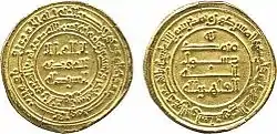 ![]() دينار ضرب في عهد القاهر بالله عام 321هـ | |||||||