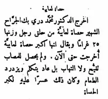 | أخرج الدكتور محمد درّي بك الجراح الشهير حصاة لعابية من حلق رجل وزنها 25 غرامًا، ويقال إنها أكبر حصاة لعابية أُخرجت حتى الآن. ولم يحصل للمريض تقيح ولا التهاب، بل عاد يتكلم ويزدرد الطعام، وكان ذلك عسرًا عليه لكبر الحصاة[7] |