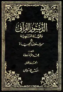 - "الدستور القرآني والسنة النبوية في شؤون الحياة"، وطُبع في مجلدين كبيرين. تصدر هذا العمل الكبير مؤلفات دروزة في المجال الإسلامي. أوضح في هذا الكتاب ما احتواه القرآن والسنة النبوية من نظم لمختلف شؤون الحياة، ويمثل هذا المؤلف تحولاً كبيراً في حياة مؤلفه بعد أن استوفى دراسات التاريخ القومي وقضايا المجتمع العربي، حيث أدرك أهمية التماس منهج القرآن والالتزام به لتحقيق أهداف الأمة العربية.