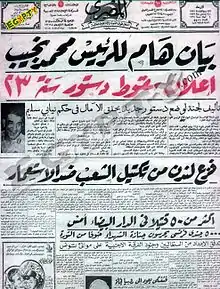 وفي السابعة من صباح ذلك اليوم أذاع الصاغ محمد أنور السادات بياناً للشعب المصري أعلن فيه اندلاع حركة سلمية بدون دماء قامت بها القوات المسلحة من أجل الأمن القومي على أساس الشرعية الثورية، وتصدرت صورة اللواء محمد نجيب الصفحة الأولى لجريدة «المصري» وفوقها مانشيت: اللواء نجيب يقوم بحركة تطهيرية في الجيش.[74][75]
