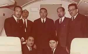 محمود المنتصر مع وزراء ومسؤولين من حكومته الثانية في زيارة لدول المغرب العربي عام 1964. من اليمين وقوفاً:خليفة التليسي، وفؤاد الكعبازي، ومحمود المنتصر، وحسين الغناي، وعبد المولى لنقي، ومن اليمين جلوساً:بشير السني المنتصر، وأحمد الصويدق.