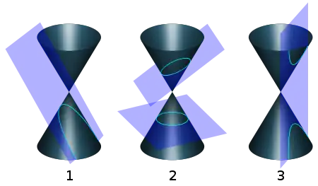 عندما يقطع مستوى مخروط فإن ذلك يولد القطوع المخروطية وهي : القطع الزائد والقطع الناقص والقطع المكافئ.