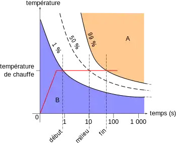 يبين الخط الأحمر تغير درجة الحرارة حيث تسخّن العينية تدريجيا خلال 1 ثانية , ثم تثبيت درجة الحرارة . يبدأ تحول البنية الداخلية في العينة من الحالة B ويصل مقدار التحول 1% إلى الحالة A . ومع استمرار الحرارة الثابتة يصل مقدار التحول 50% بعد نحو 10 ثوان حيث يتواجد في العينة خليط من الحالتين B و A ، ومع الاستمرار في ثبات درجة الحرارة يتم تحول الحالة B إلى الحالة A بنسبة 100% بعد نحو 80 ثانية. المحور الأفقي يبين الزمن بالثانية في تقسيم لوغاريتمي .