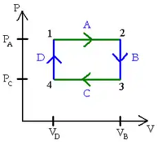 ويبين شكل المجاور لمخطط الضغط والحجم عند درجة حرارة ثابتة. تتابع عمليات من النقطة 1 إلى 2 ، ثم من 2 إلى 3 ، وهكذا حتى العودة إلى النقط 1 بعد إجراء 4 عمليات من تغير الحجم والضغط . ونجد أن تغيرالضغط أثناء العملية من 2 - 3 , العملية 4 - 1 تتمان مع ثبات الحجم . في حين أن التغير بين 1 - 2 والتغير بين 3 - 4 يتمان مع ثبات درجة الحرارة .