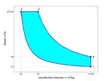 فبالنسبة إلى مخطط الدورة يعطينا المساحة المحصورة في الدورة كمية الشغل. وعلى سبيل المثال فالعمليات 1-2-3 تنتج شغلا، ولكن العمليات 3-4-1 فهي تحتاج بتزويدها بكمية أصغر من الطاقة لكي تعود إلى نقطة البداية وبالتالي الحالة الأصلية. وبناء على ذلك يكون صافي الشغل المؤدى من الدورة الفرق بين المسارين .