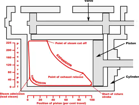 ينشأ المخطط برسم تغيرات الضغط وتغيرات حجم البخار المقابلة في اسطوانة الآلة عن طريق تعيين حركة المكبس. فيمكن بذلك حساب الشغل الصافي الناتج من الدورة وبالتالي قياس القدرة الناتجة من الآلة. [1]