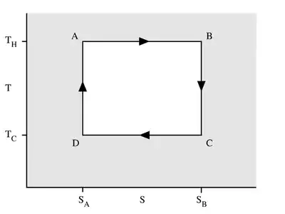 وتنبع أهمية هذا المخطط من أن المساحة تحت هذا المنحنى تساوي كمية الحرارة المعطاة إلى النظام أو المأخوذة منه، وذلك عندما تجري عملية تغيير حالة النظام عن طريق تغيير درجة الحرارة مثلا كعملية عكوسية. عن طريق رسم المخطط يمكن استنتاج كفاءة دورة مكونة من أربعة عمليات : عمليتان من نوع عملية متساوية الإنتروبية و عمليتين من نوع عملية متساوية درجة الحرارة . تلك الدورة تسمى دورة كارنو وهي الممثلة في مخطط درجة الحرارة والإنتروبي المبينة في الشكل، ويمكننا تعيين المساحة المحورة فيها بسهولة، فنحصل على كفاءة الآلة .